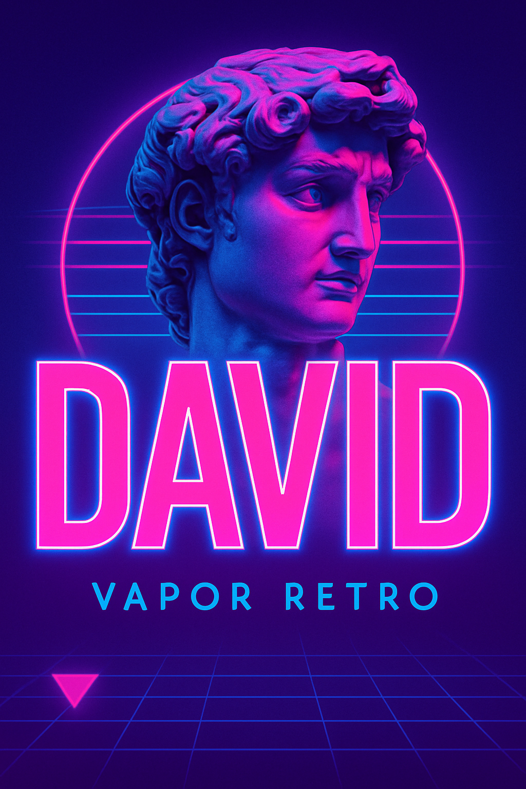 /Collection: /by davooda/Type: PNG/A striking digital artwork combining classical sculpture with neon vaporwave aesthetics. The iconic David statue is presented in vibrant colors, ideal for modern art promotions or digital media.
