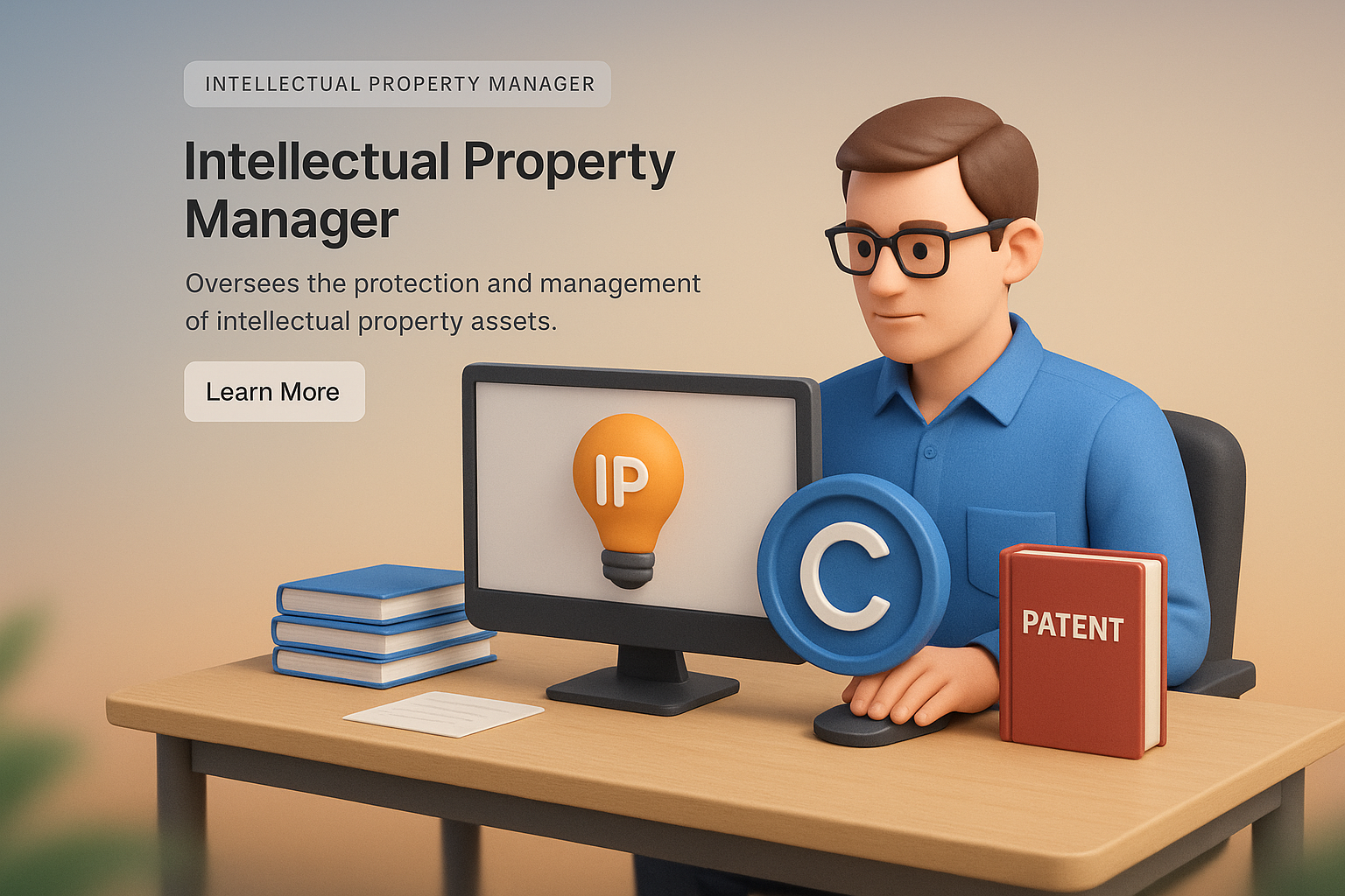 /Collection: /by davooda/Type: PNG/A detailed 3D illustration depicting an Intellectual Property Manager at a desk. The scene features a computer, icons for IP and copyright, and a book labeled 'PATENT', all designed in a realistic style.
