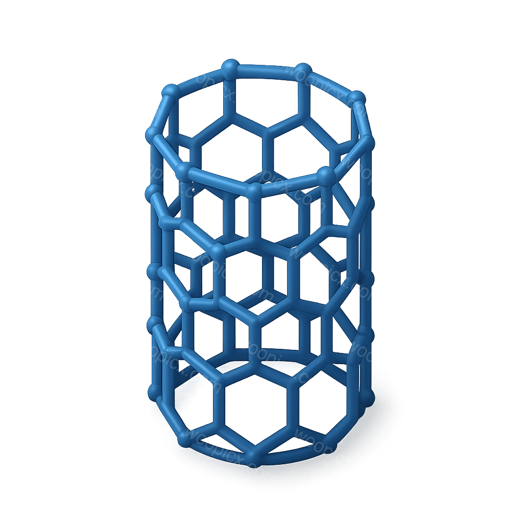 A blue 3D icon of carbon nanotubes designed in a three-quarter isometric view, featuring a transparent background. The structure showcases a cylinder formed by interconnected hexagonal rings.