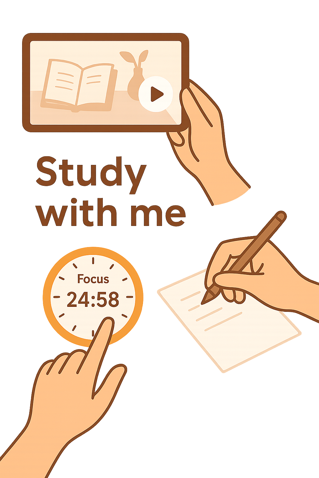 /Collection: /by davooda/Type: PNG/Illustrative graphic designed to promote study sessions, featuring hands holding a tablet, a timer, and a notepad. Ideal for educational content on social media or study apps.