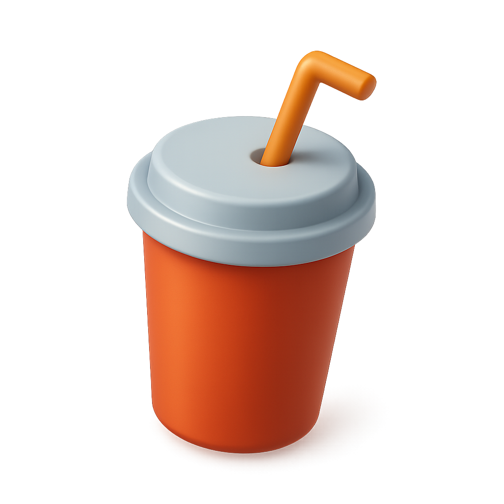 A visually appealing 3D icon of a beverage cup with a lid and a straw, featuring a vibrant orange color and a smooth, glossy finish, set against a soft gradient background.
