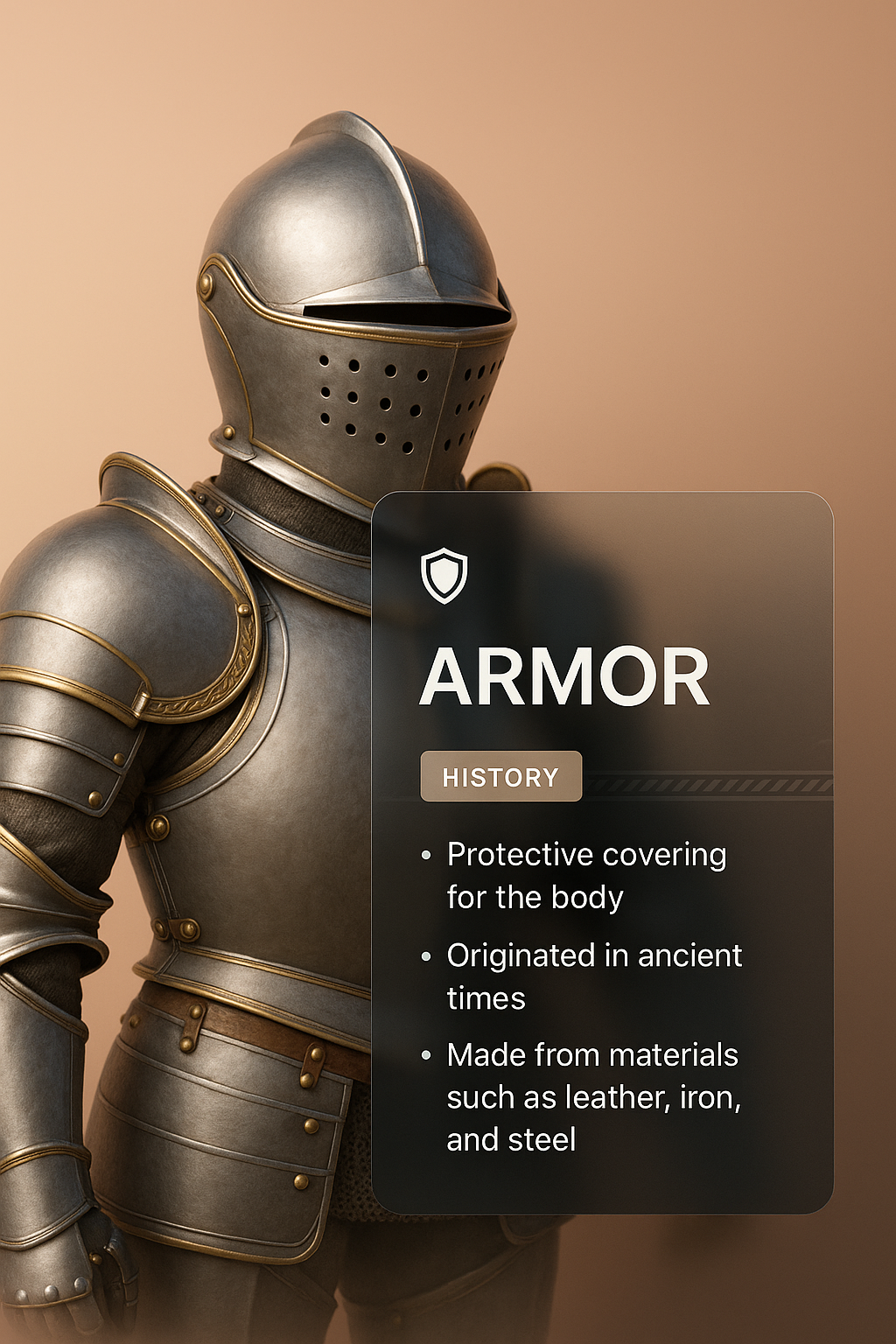 /Collection: /by davooda/Type: PNG/A detailed 3D rendering of historical armor, featuring a sleek design and an integrated informative overlay. The background uses a smooth gradient, enhancing the visual appeal.
