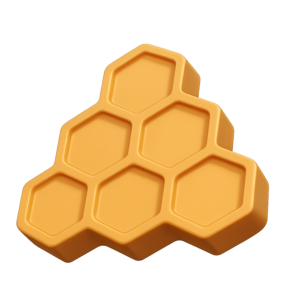 A stylized 3D honeycomb icon featuring a hexagonal pattern. The design showcases a three-quarter view with a glossy finish, set against a gradient background.