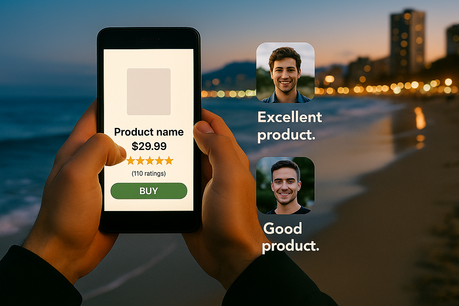 A mobile device showcasing an online product with user ratings, set against a scenic beach background. Ideal for digital marketing and e-commerce presentations.