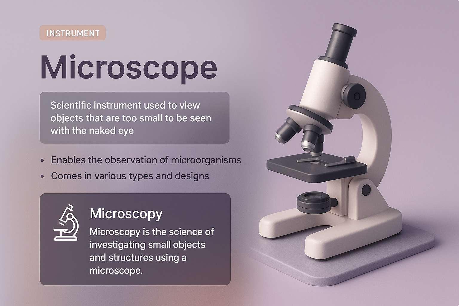 A 3D illustration of a microscope with a smooth gradient background. It features informative text blocks about microscopy, detailing its function and types.