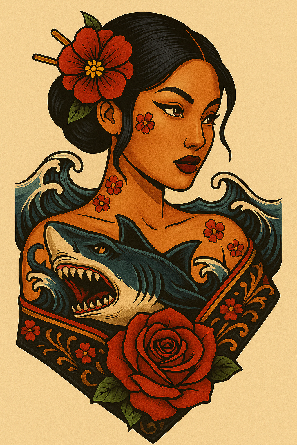 Stylized Tattoo Art of a Woman with Shark and Floral Elements