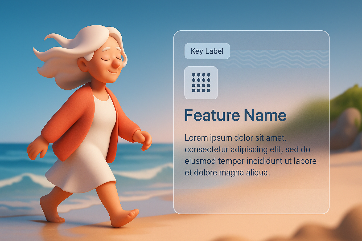 A vibrant 3D illustration of a mature woman strolling along a beach, showcasing a gentle gradient background and a clear, cohesive design with a feature block.