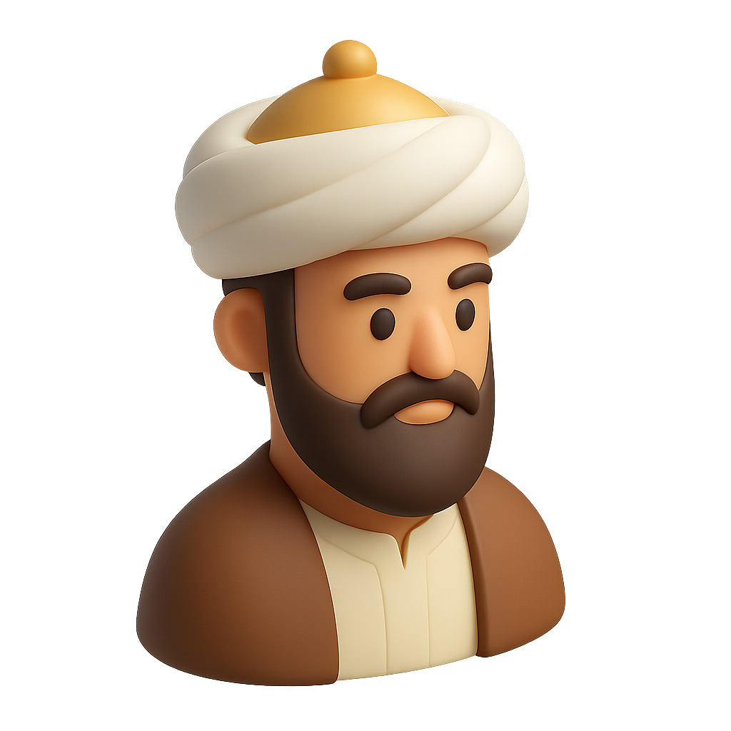 /Collection: /by davooda/Type: PNG/A stylized 3D representation of an Islamic leader, featuring a turban and traditional attire. The icon is designed in a three-quarter view with a volumetric and isometric feel, set against a soft gradient background.