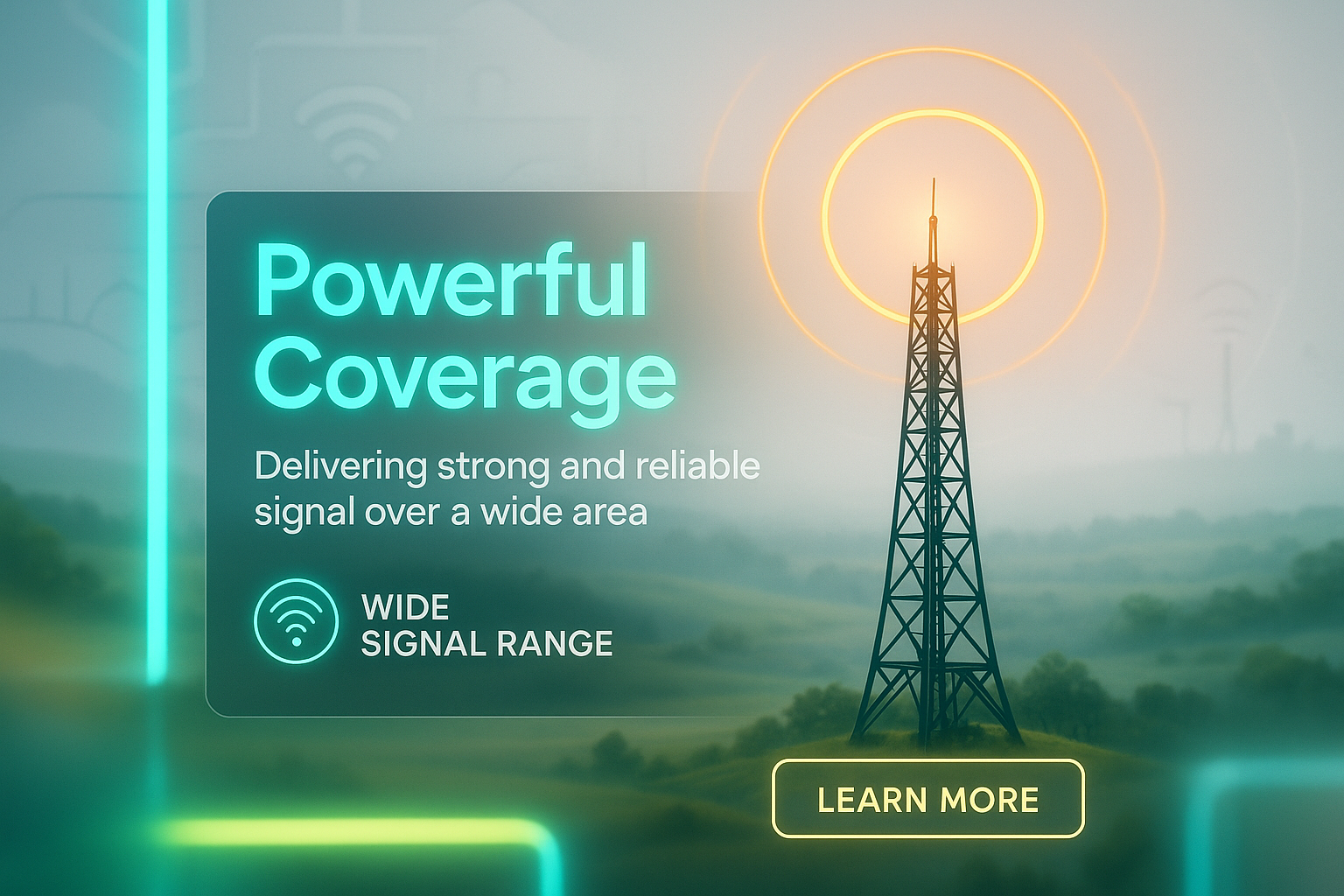 Informative banner illustrating reliable telecommunications coverage with a stylized tower and glowing elements, ideal for digital marketing in tech sectors.