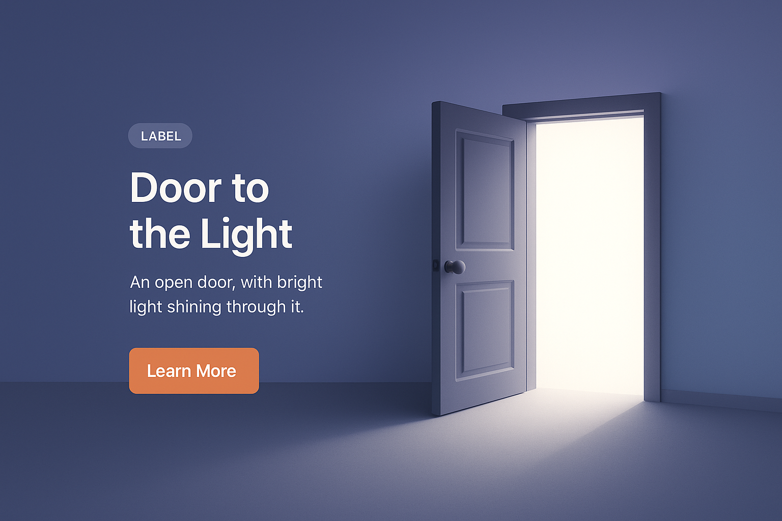 /Collection: /by davooda/Type: PNG/A 3D illustration of an open door emitting bright light. The scene is zoomed out, showcasing minimalistic design elements like a label, heading, text block, and action button.