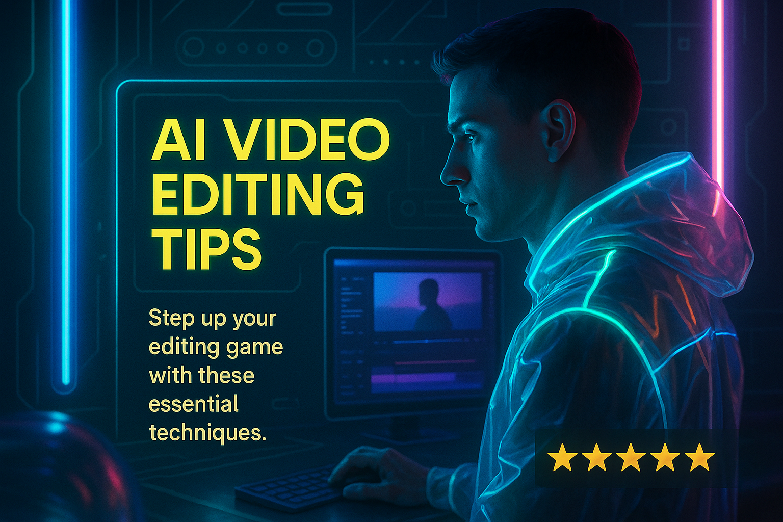A vibrant promotional graphic featuring a modern individual focused on video editing, ideal for tech and editing tutorials. The design includes neon elements, creating a futuristic aesthetic.