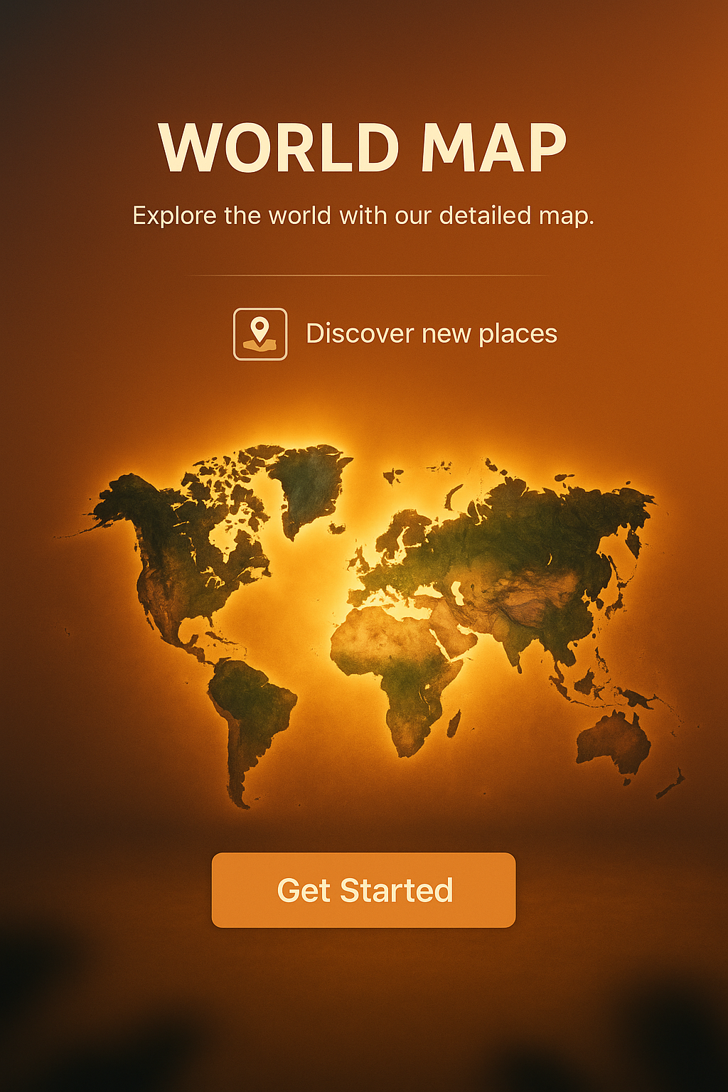 /Collection: /by davooda/Type: PNG/This image features a stylized world map with an orange gradient background, designed for a digital interface. It invites users to explore new places, suitable for travel or educational apps.