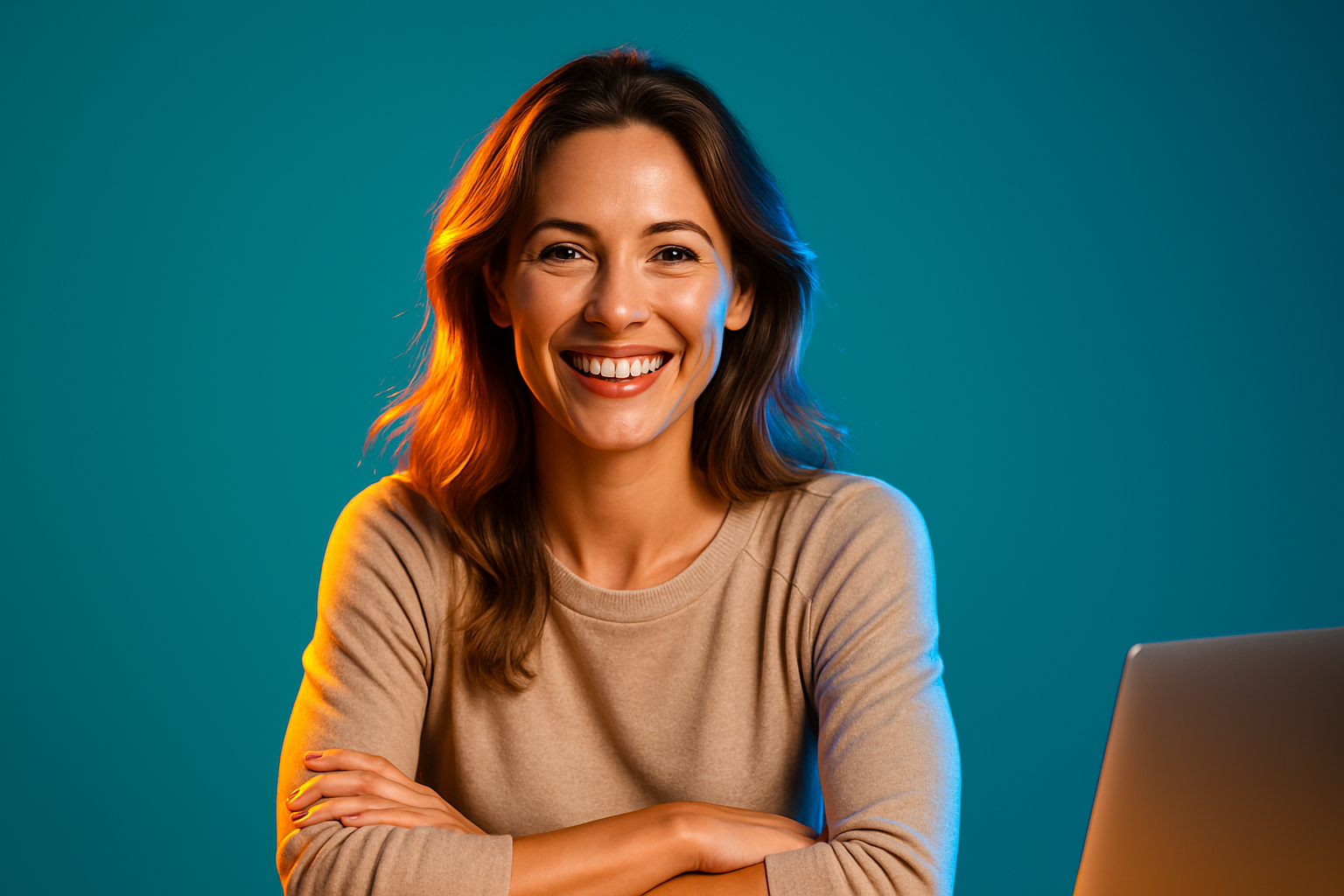 A beautiful, happy woman smiles at the camera while sitting in an office setting, illuminated by contrasting lights. The vibrant solid background enhances her joyful expression.
