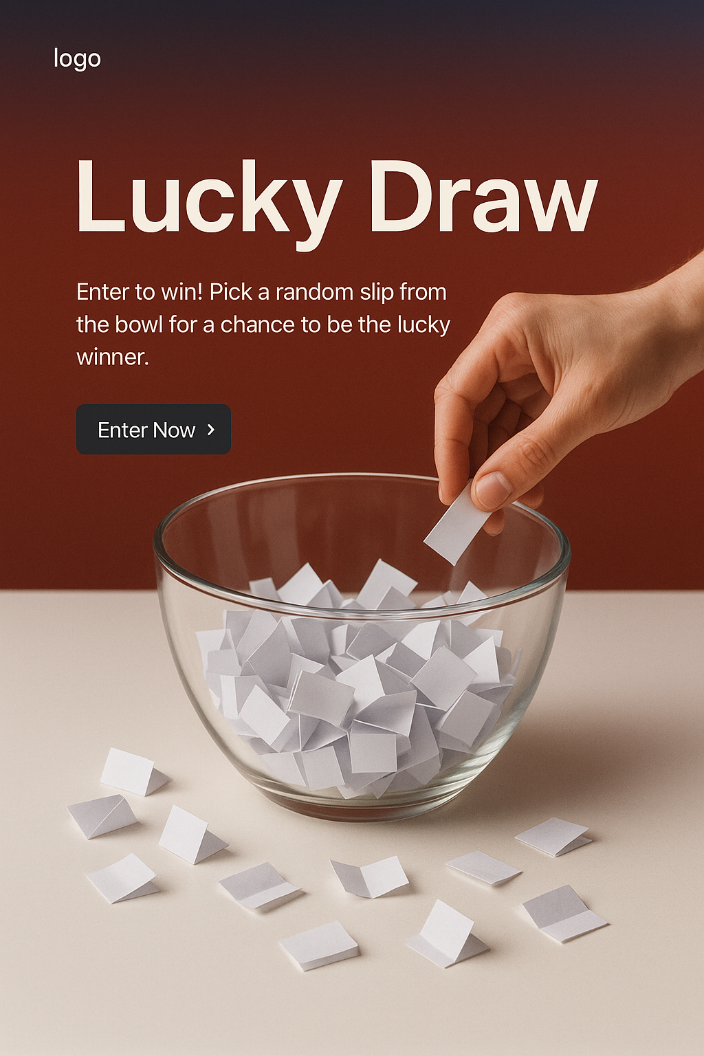 A stylish bowl filled with paper slips for a lucky draw. A hand reaches in to pick a slip, set against a gradient background. The design is modern and inviting.