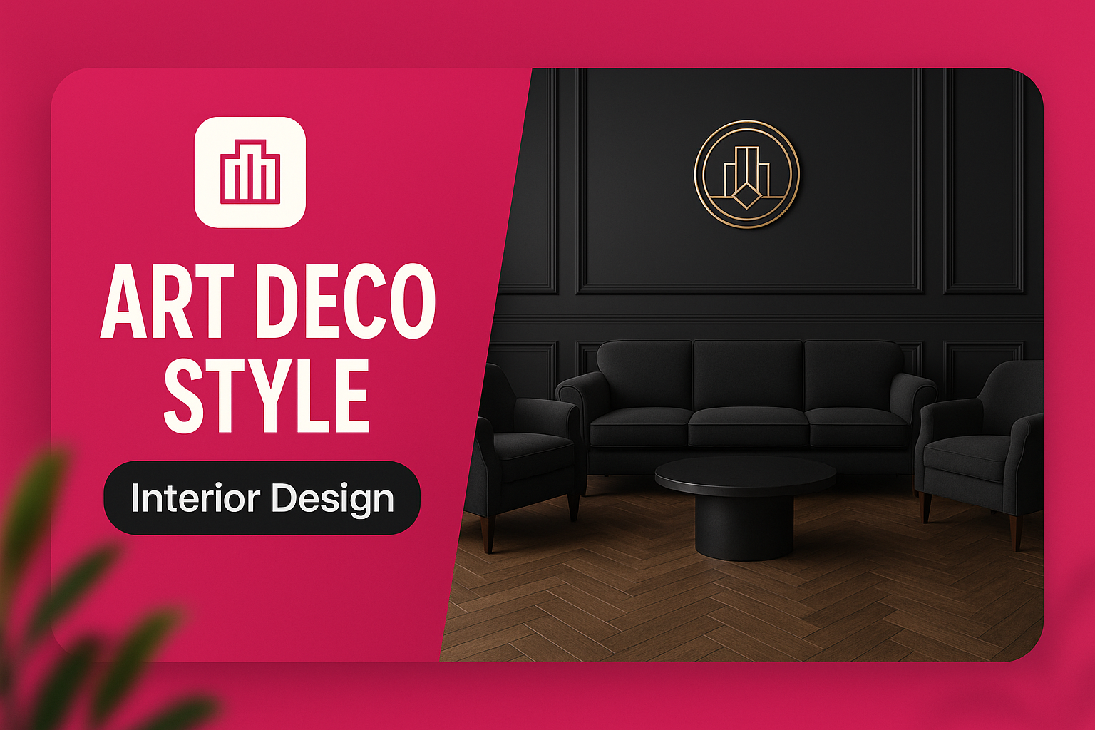 Stylish graphic promoting Art Deco interior design featuring a modern lounge setup. Ideal for interior design presentations and marketing materials.