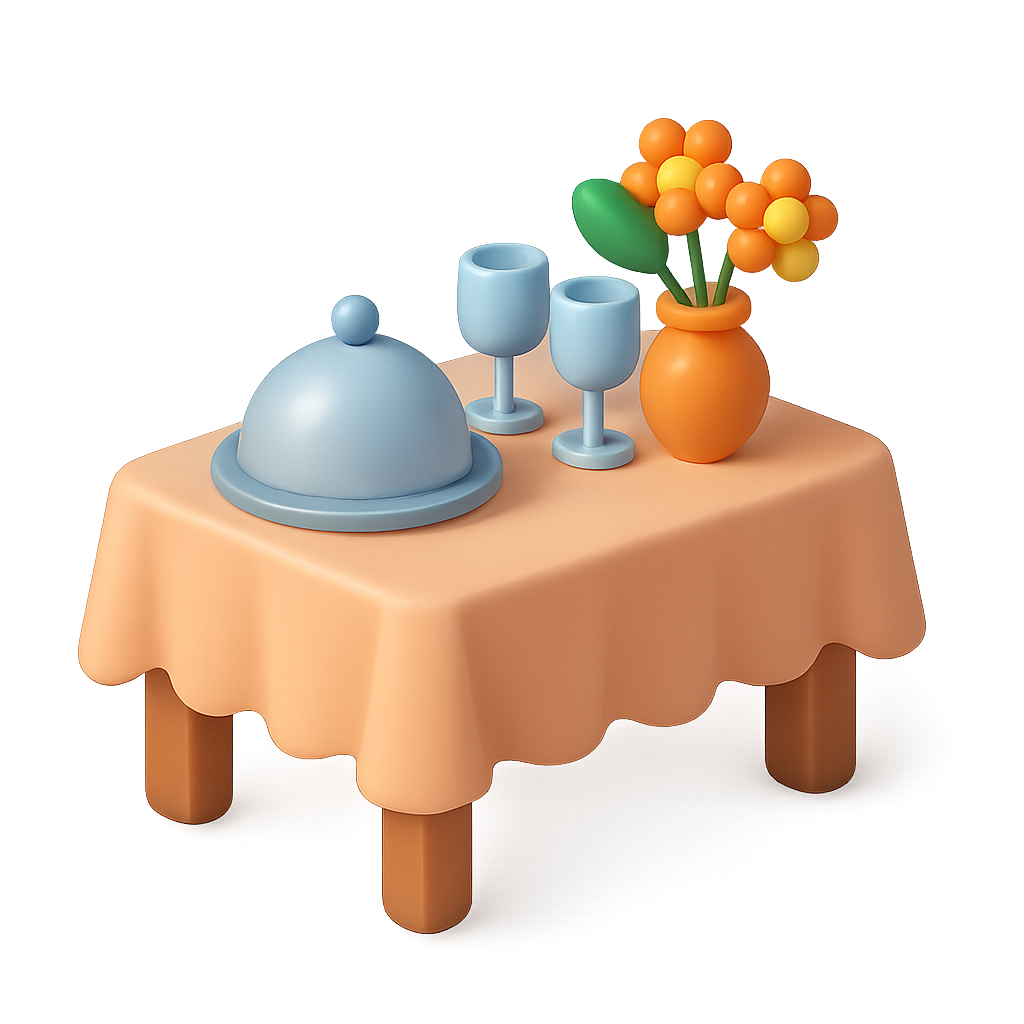 /Collection: /by davooda/Type: PNG/A vibrant 3D icon featuring a table set with a covered dish, two glasses, and a colorful flower vase. The design showcases a warm color palette and a glossy finish.