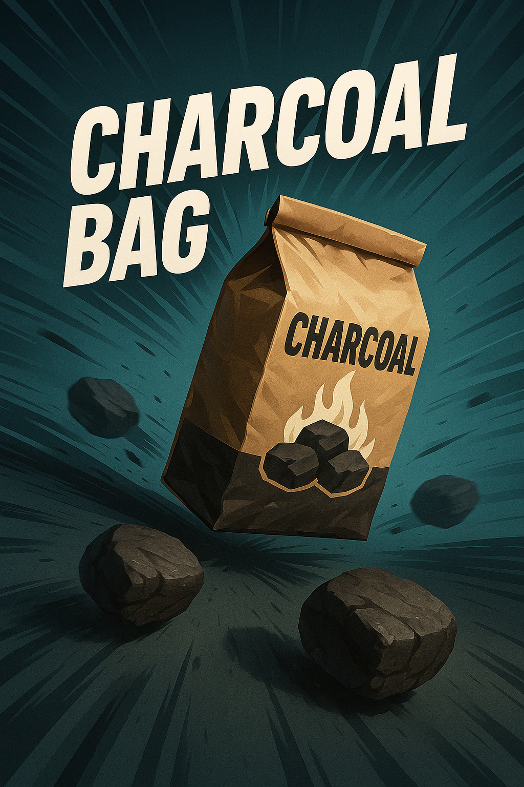 /Collection: /by davooda/Type: PNG/A visually striking illustration of a charcoal bag, featuring dynamic lines radiating from the center, enhancing the feeling of motion. The bag showcases a bold title with contrasting colors, set against a smooth gradient background.