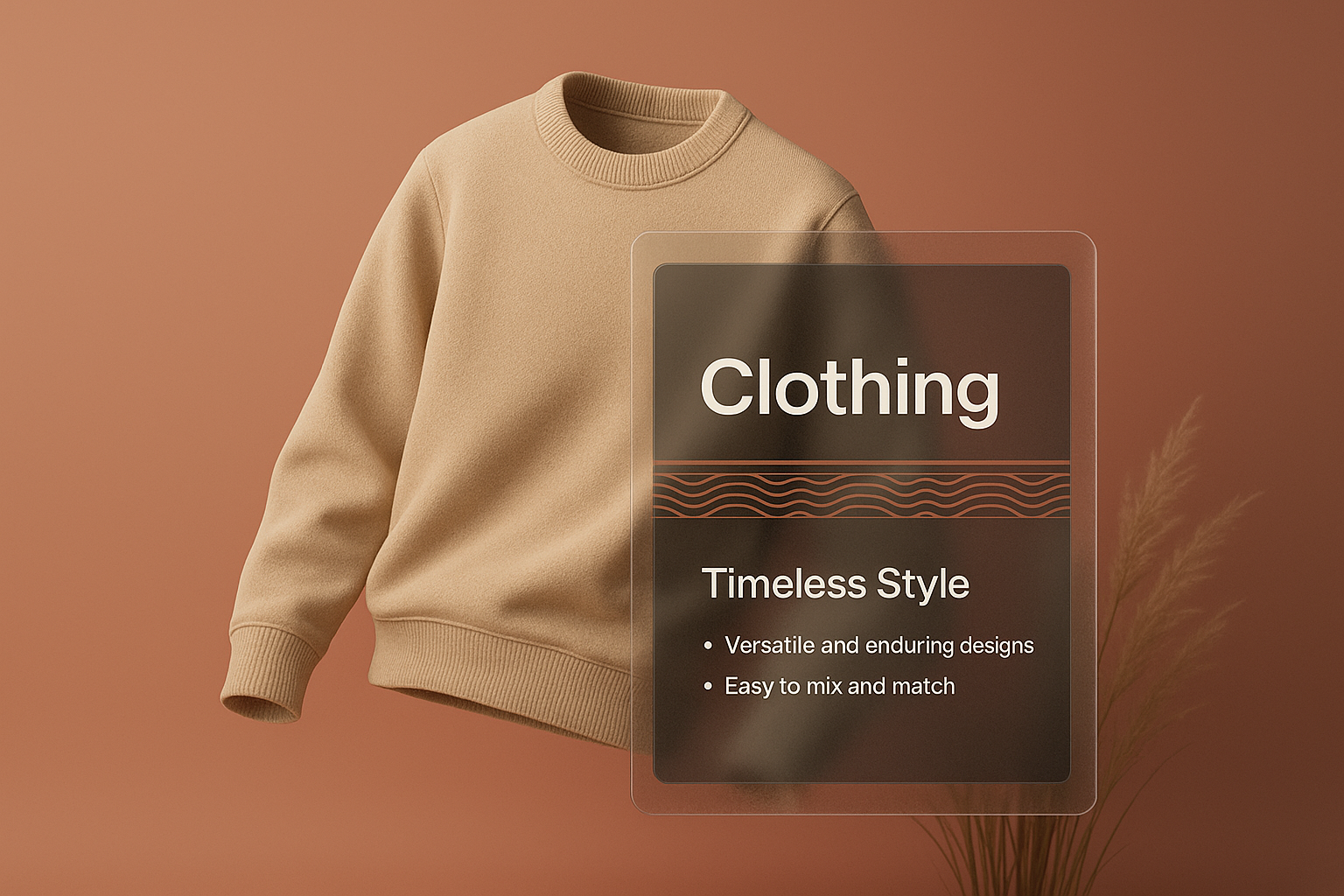 A 3D illustration of a casual beige sweater against a smooth gradient background. The design includes a transparent label showcasing the word 'Clothing' with additional details on style versatility.