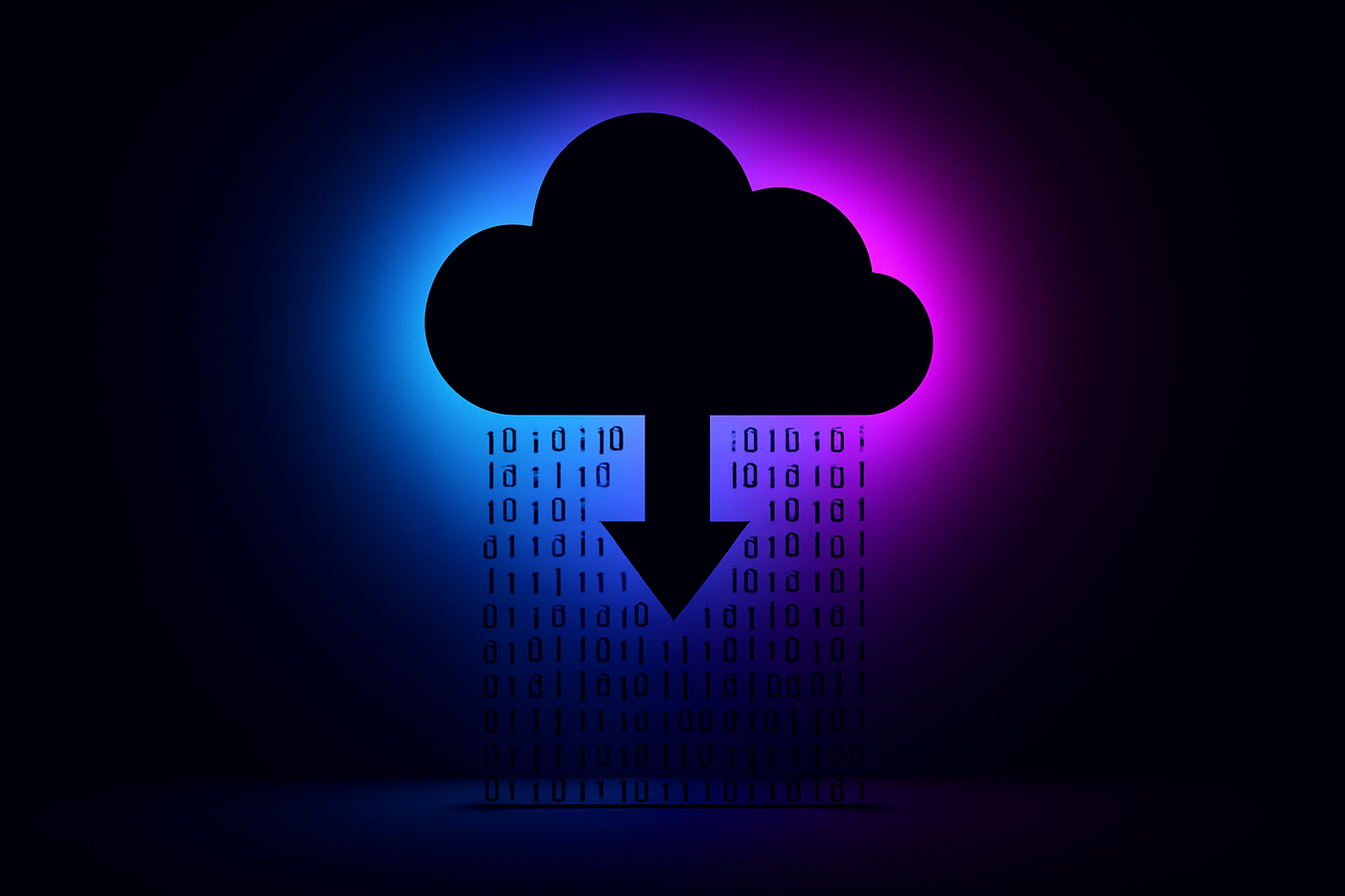 /Collection: /by davooda/Type: PNG/A silhouette of a cloud icon with binary code raining down, set against a vibrant, gradient background of blue and purple, symbolizing advanced data transfer.
