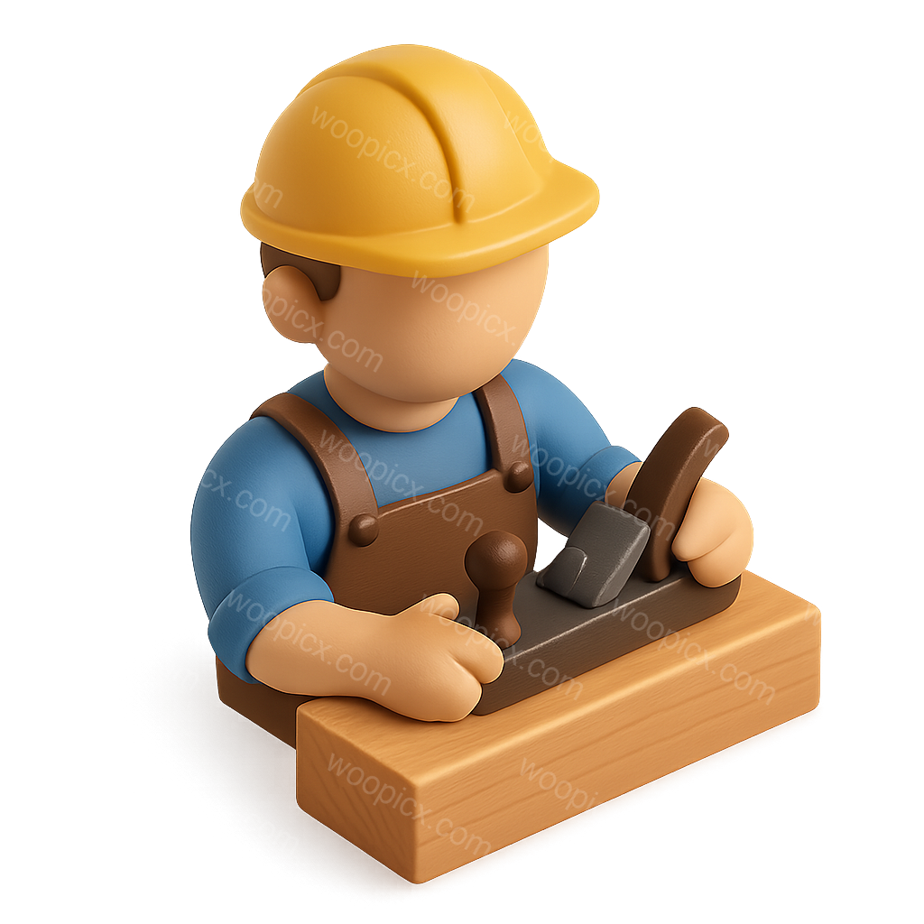A 3D icon of a furniture maker wearing a yellow hard hat, using a hand plane. The design showcases a three-quarter view with a volumetric, isometric style.