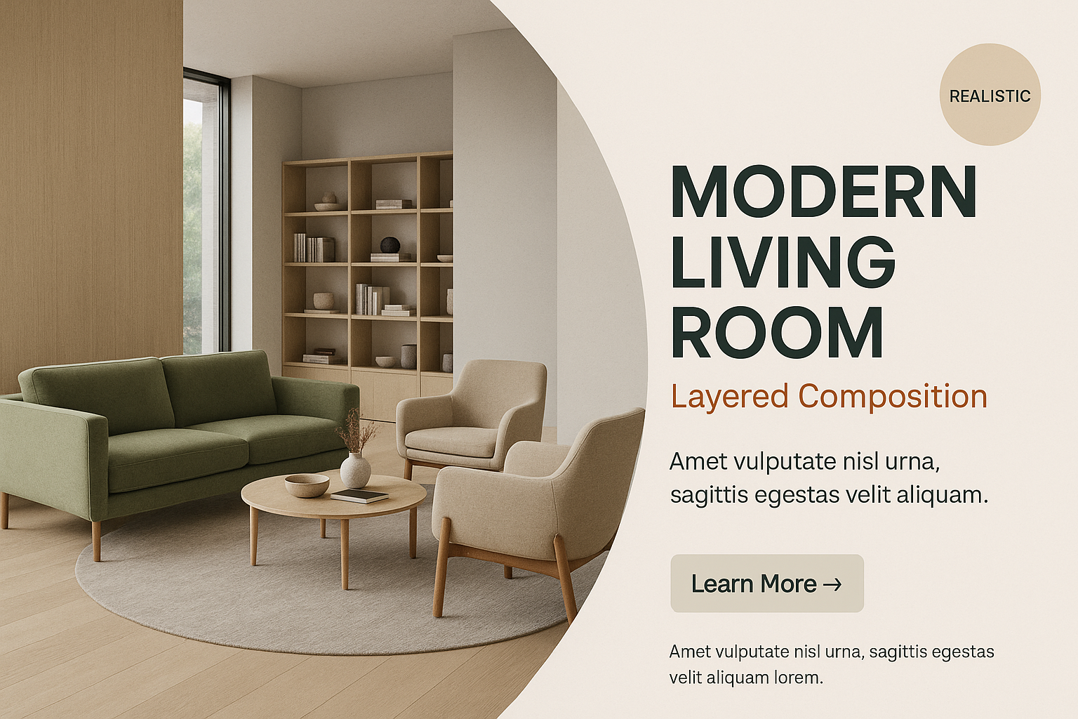 /Collection: /by davooda/Type: PNG/A spacious modern living room featuring a green sofa, stylish armchairs, and a coffee table adorned with decor. The background includes a shelf, creating a balanced and realistic aesthetic.