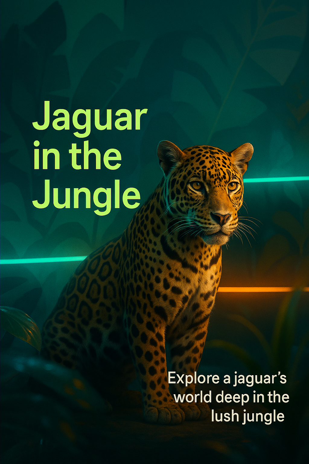 Stunning illustration of a jaguar set in a vibrant jungle background with dramatic lighting. Ideal for wildlife exploration themes or educational content.