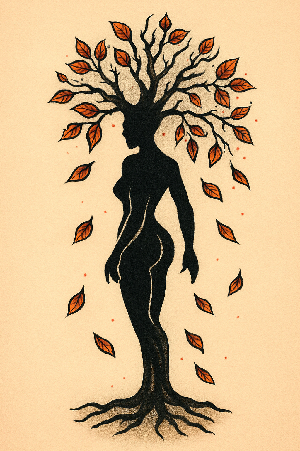 /Collection: /by davooda/Type: PNG/A striking tattoo design featuring a silhouette of a woman whose body transforms into a tree, with autumn leaves falling around her. The artwork is set against a soft beige background, showcasing earthy tones.