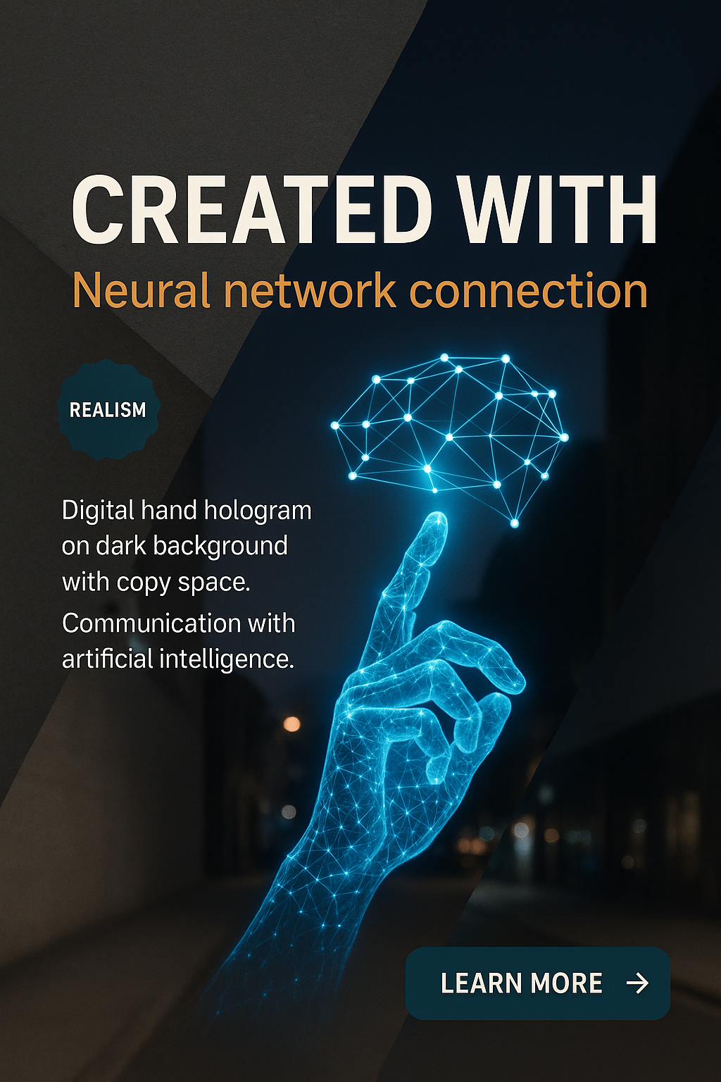 /Collection: /by davooda/Type: PNG/A digital hand hologram on a dark background, showcasing a neural network connection. The design emphasizes realism and includes call-to-action elements for engaging user interaction.