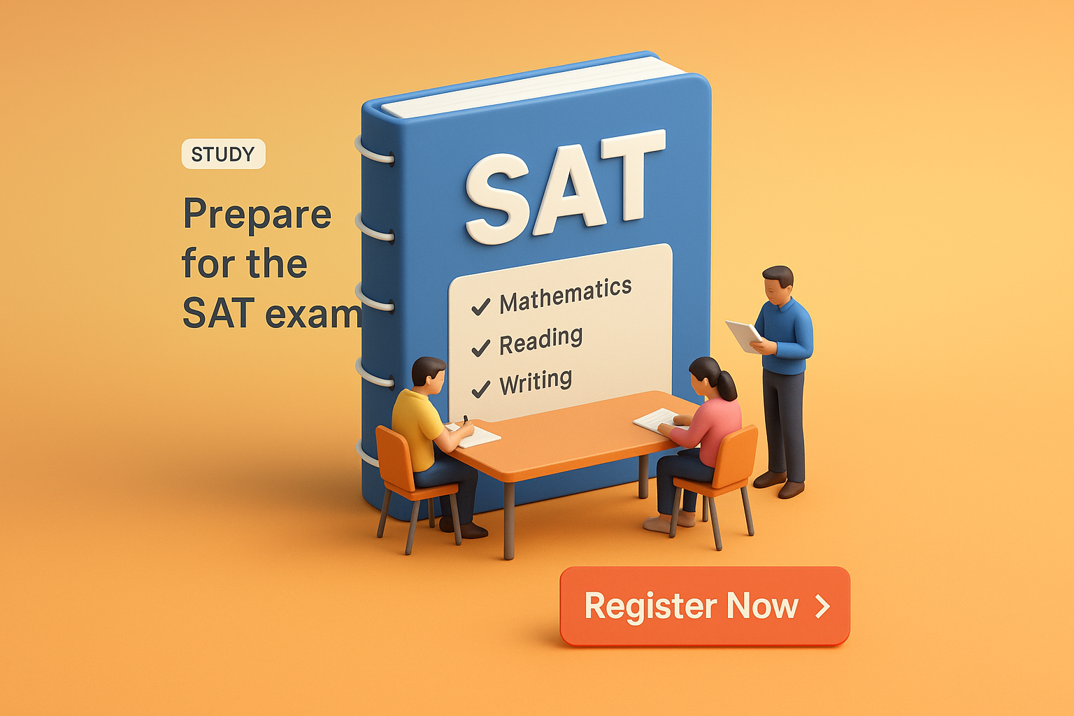 A visually appealing 3D scene depicting a study environment for the SAT exam. Features a large SAT book, two students engaged in study tasks, and a prominent registration button.