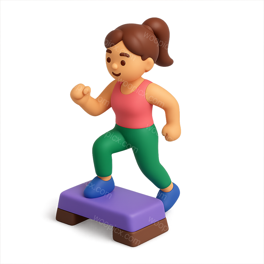 /Premium/Collection: /by davooda/Type: PNG/A vibrant 3D icon depicting a female character engaged in aerobic exercise on a step platform. The character sports a pink top and green pants, with a playful design and volumetric appearance.