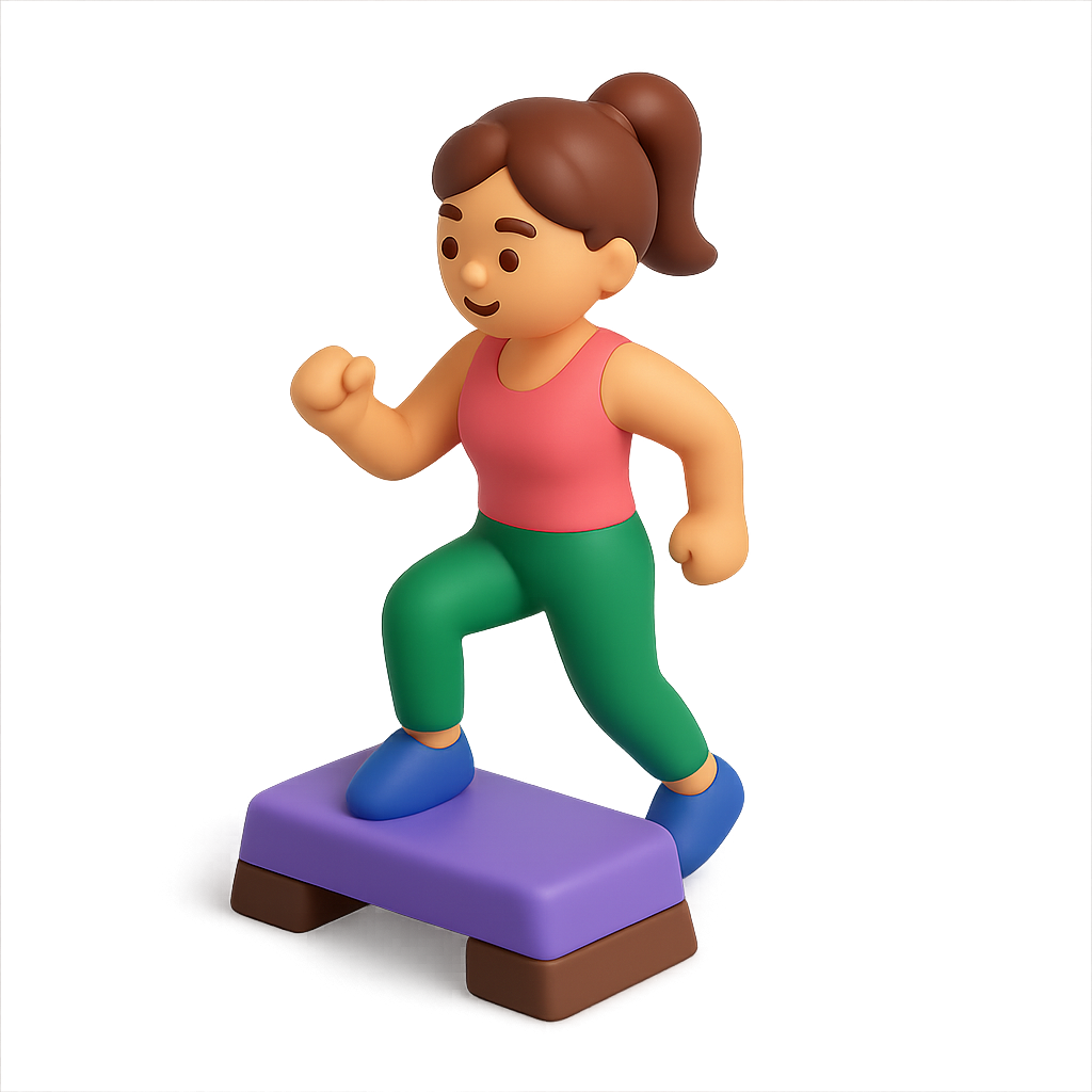 /Collection: /by davooda/Type: PNG/A vibrant 3D icon depicting a female character engaged in aerobic exercise on a step platform. The character sports a pink top and green pants, with a playful design and volumetric appearance.