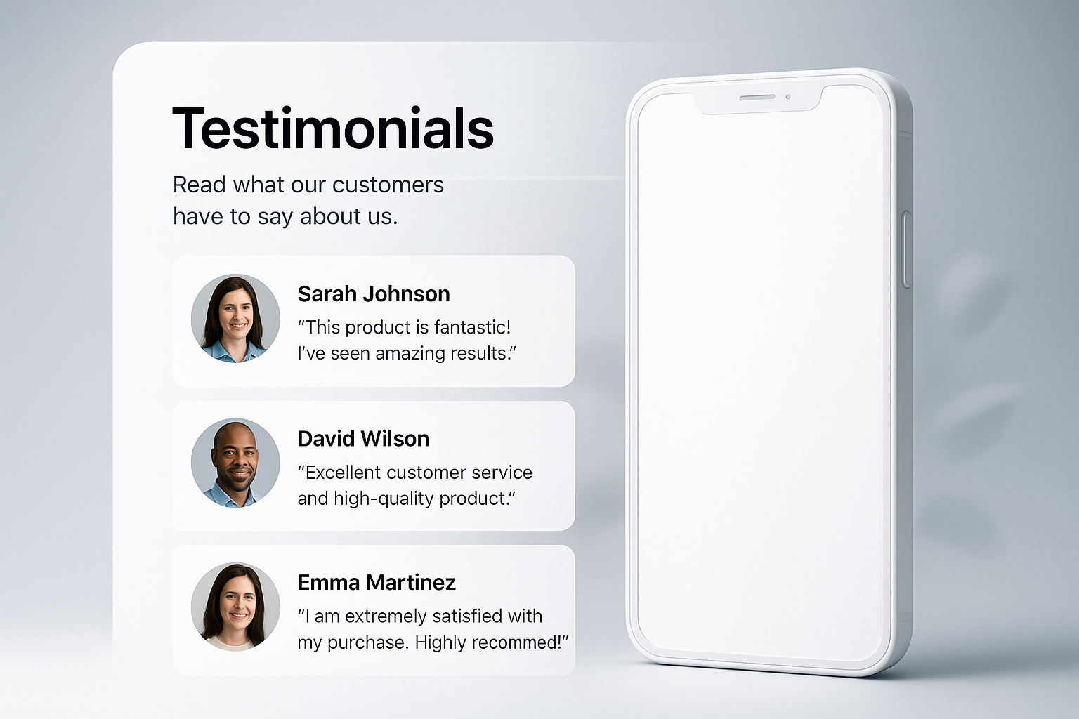/Collection: /by davooda/Type: PNG/A clean design showcasing customer testimonials alongside a realistic smartphone mockup. Features three testimonial cards with photos and quotes, perfect for UX design.