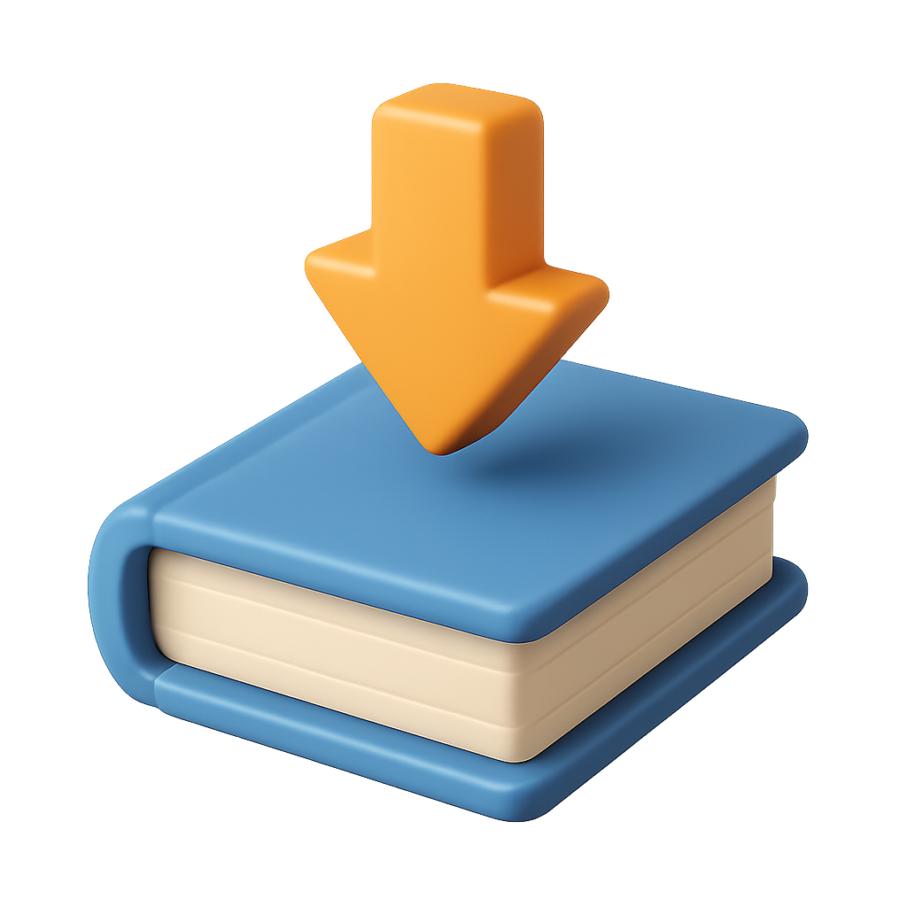 A visually appealing 3D icon featuring a book with a prominent download arrow above it. The design showcases a blue book and an orange arrow in a three-quarter isometric view.