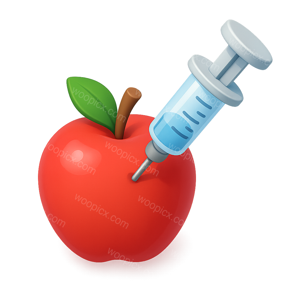A bright red apple with a syringe inserted into its side, showcasing a glossy 3D effect. The syringe is detailed, with a clear barrel and visible markings, set against a soft gradient background.
