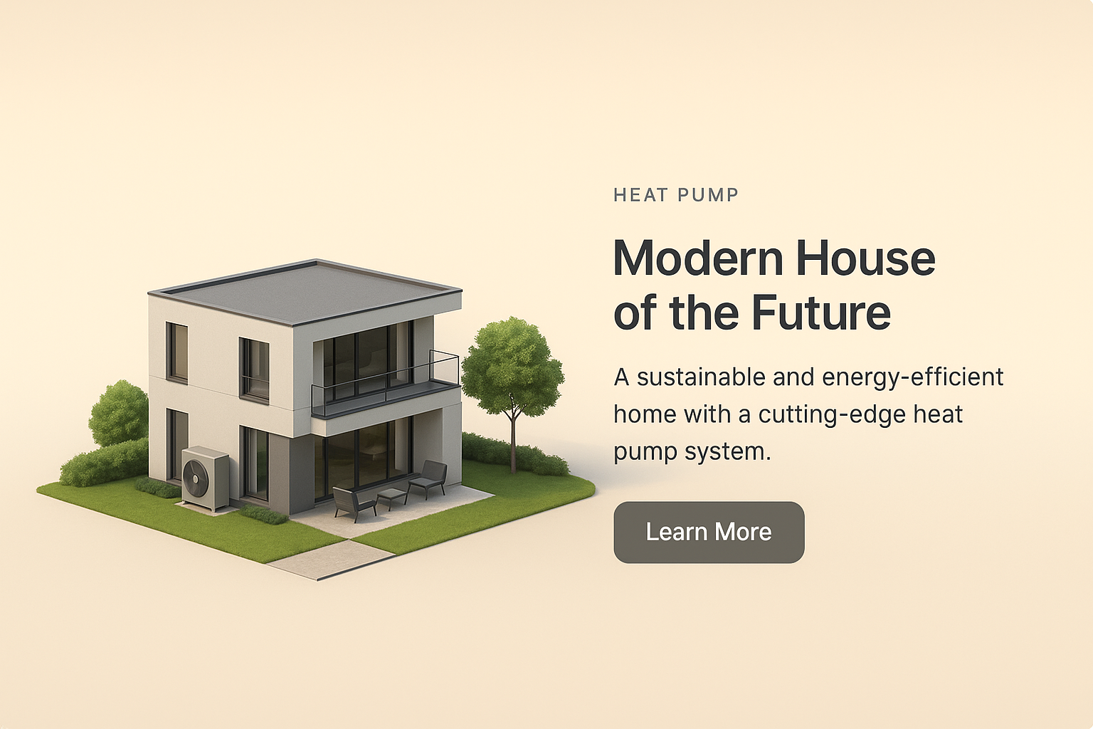 /Collection: /by davooda/Type: PNG/A 3D illustration of a modern house showcasing an efficient heat pump. The scene is zoomed out to provide a comprehensive view, highlighting the sustainable design and surroundings.