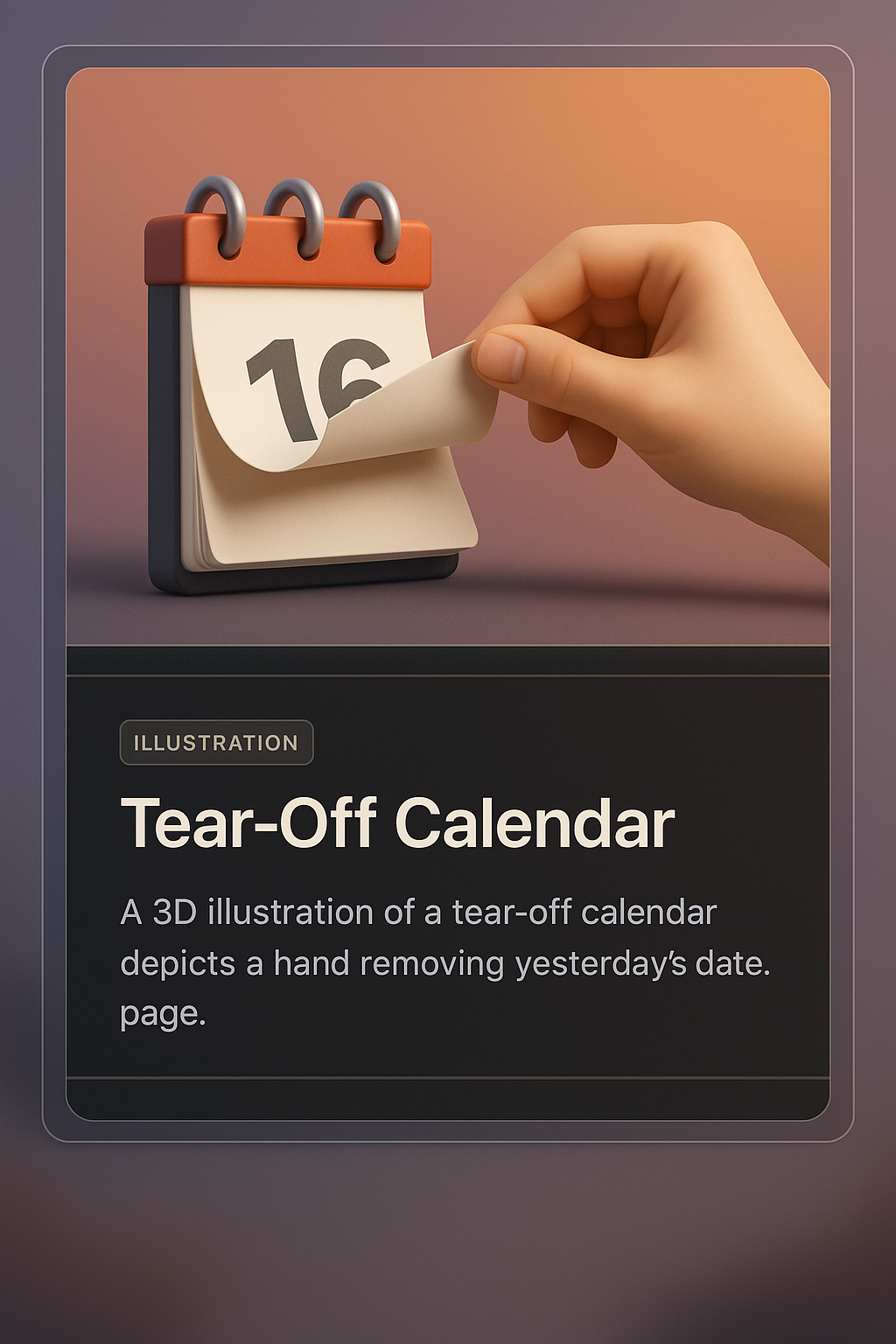 This 3D illustration features a hand tearing off yesterday's date from a tear-off calendar. The design showcases a smooth gradient background and a modern aesthetic.