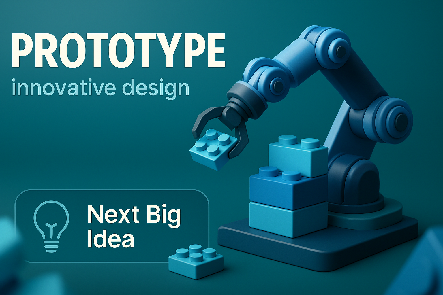 /Collection: /by davooda/Type: PNG/A visually striking 3D composition showcasing a robotic arm interacting with building blocks. The design features a smooth gradient background and clear, bold text emphasizing innovation.