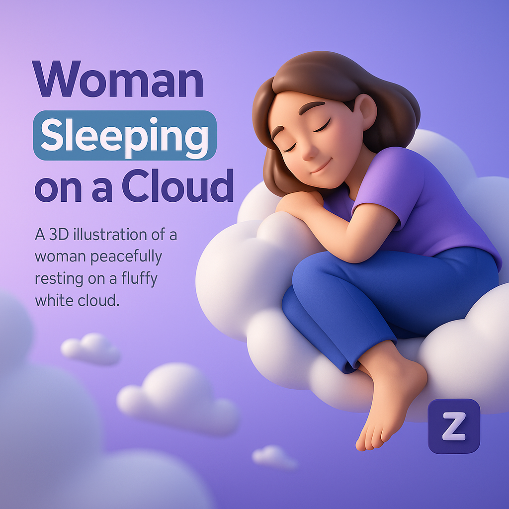 A whimsical 3D illustration depicting a woman peacefully sleeping on a fluffy cloud, featuring soft colors and a serene atmosphere. Ideal for relaxation themes.