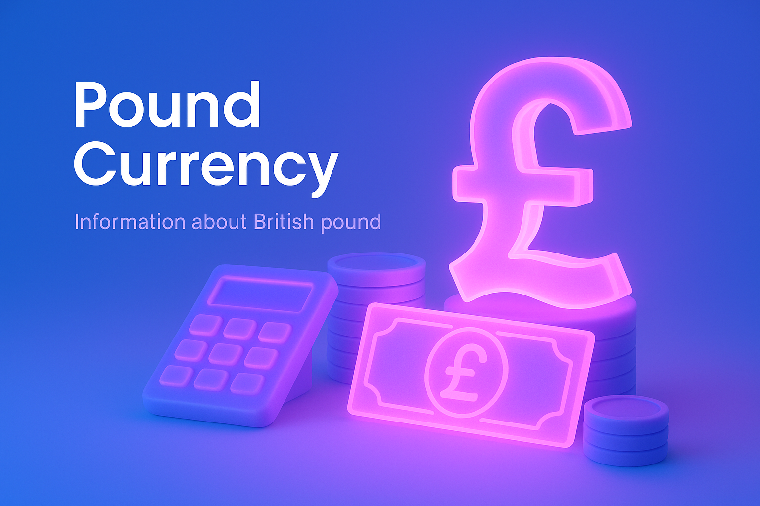 A visually striking composition showcasing the British pound symbol with neon pink illumination. Accompanied by coins and a calculator, all set against a solid blue background.