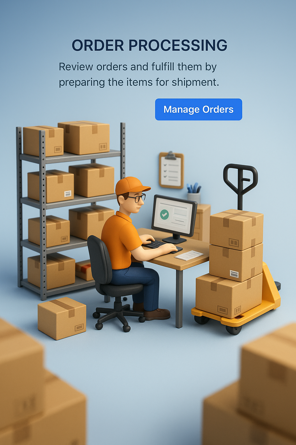 /Collection: /by davooda/Type: PNG/A realistic 3D illustration depicting a warehouse order processing scene. A worker at a desk reviews orders on a computer, surrounded by stacked boxes and a pallet jack.