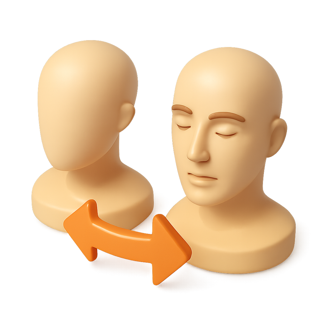 The image features two 3D stylized human head icons, one facing forward and the other with eyes closed. An orange motion arrow symbol is placed between them, suggesting interaction or transformation.
