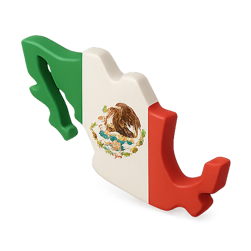 A three-dimensional representation of the map of Mexico, featuring the national flag colors of green, white, and red. Ideal for educational materials or cultural presentations.
