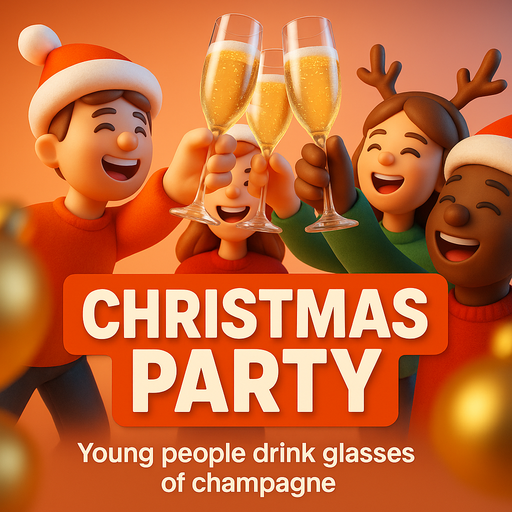 /Collection: /by davooda/Type: PNG/This colorful digital illustration depicts a group of young friends celebrating at a Christmas party, raising glasses of champagne. The vibrant style and festive theme suit holiday marketing.