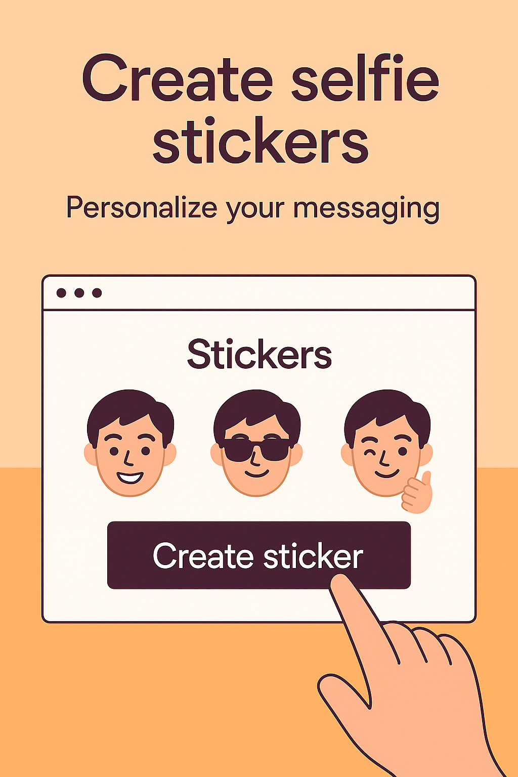 /Collection: /by davooda/Type: PNG/Engaging promotional image showcasing the process of creating personalized selfie stickers. Features playful illustrations and a user-friendly design suitable for social media marketing.