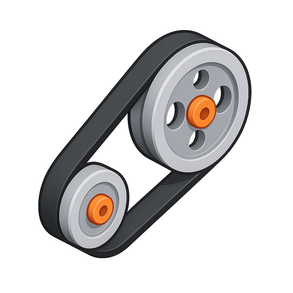 /Collection: /by davooda/Type: PNG/A three-dimensional isometric illustration of a belt and pulley system featuring a larger and smaller pulley. The design includes gray pulleys with orange accents, set against a transparent background.
