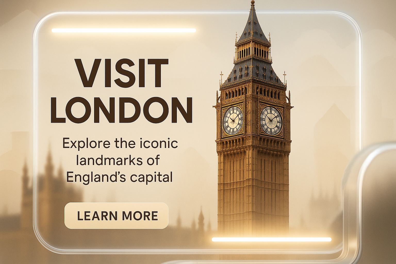 Engaging travel promotion banner featuring iconic London landmarks with a modern design, ideal for tourism campaigns and social media marketing.