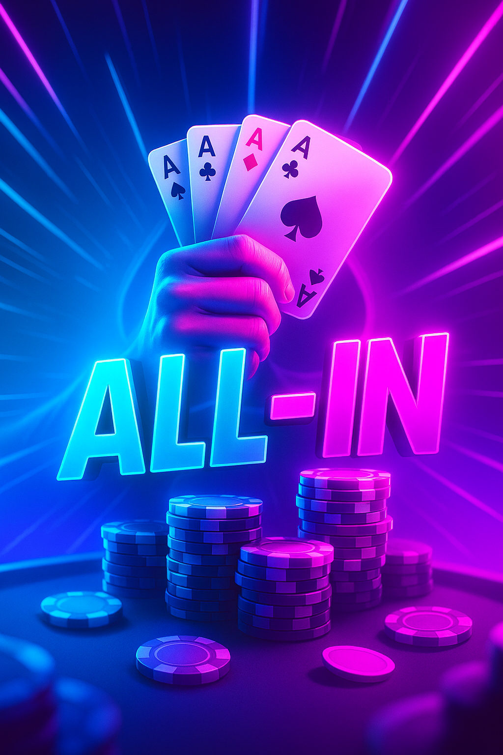 A vibrant poker scene showcasing a hand holding four aces amidst glowing poker chips. The neon hues create a dynamic atmosphere, emphasizing the all-in action.