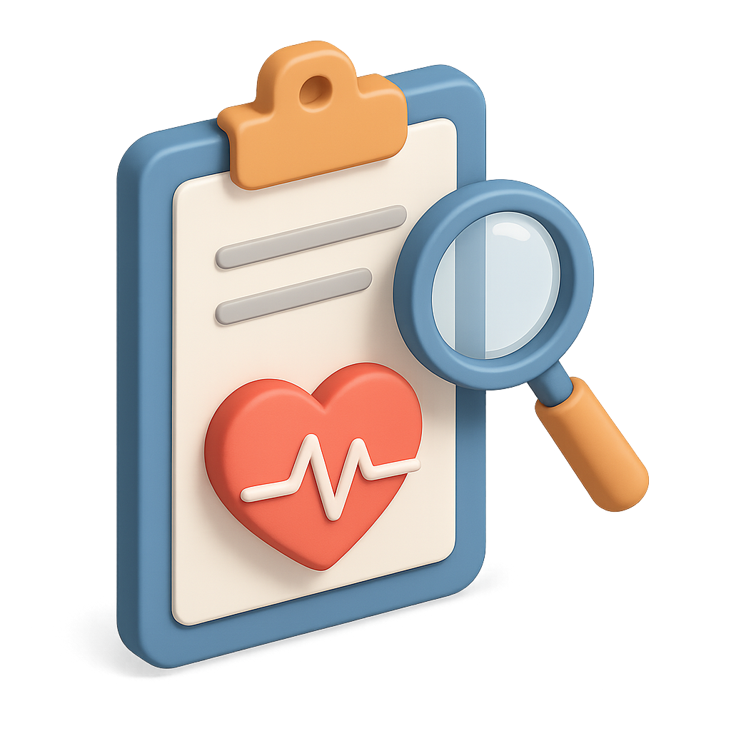 /Collection: /by davooda/Type: PNG/A stylized 3D icon depicting a clipboard with a heart and an electrocardiogram line, alongside a magnifying glass. The design is isometric and has a transparent background, conveying a modern medical diagnosis theme.