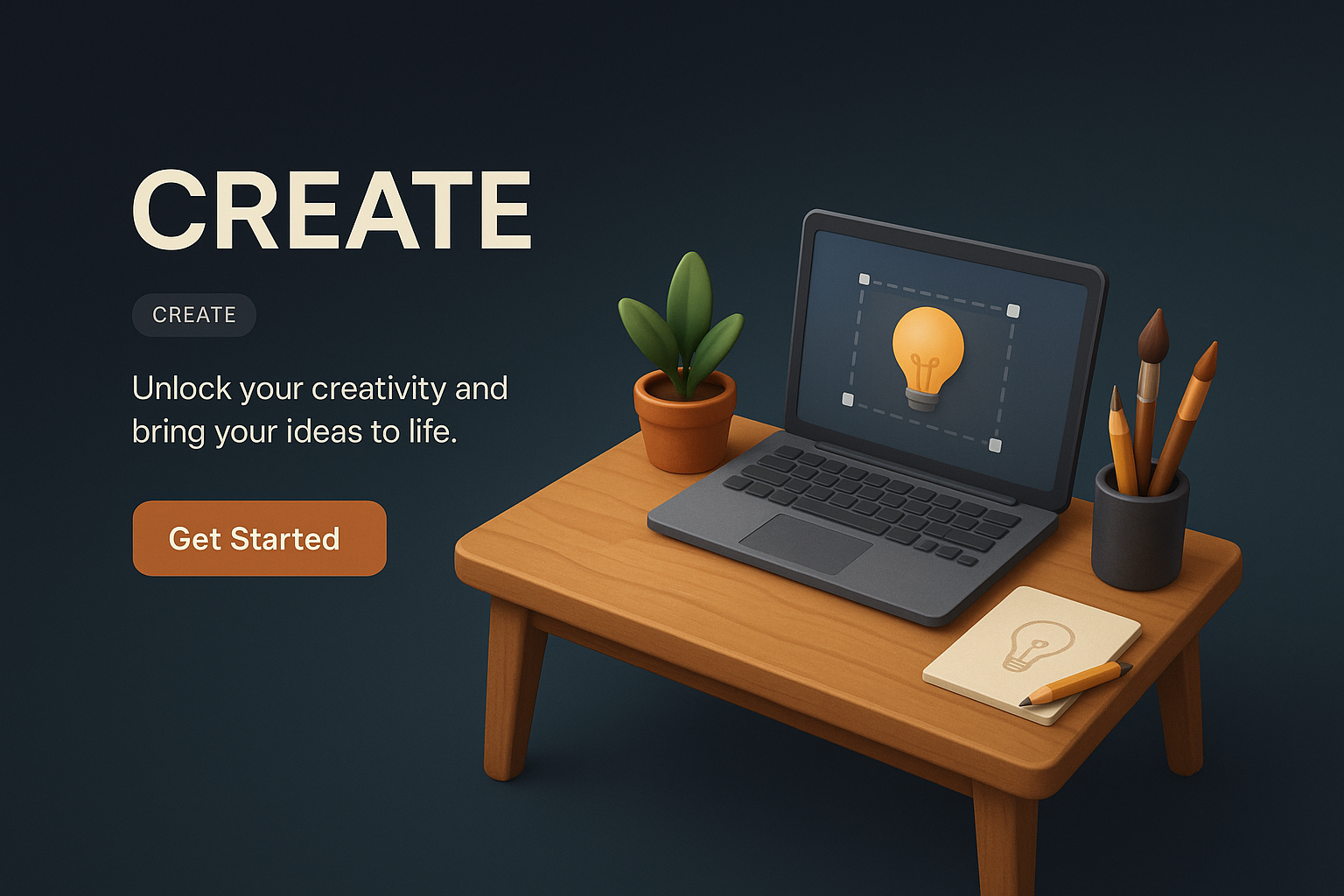 /Collection: /by davooda/Type: PNG/A zoomed-out, realistic 3D scene featuring a creative workspace. It includes a laptop, potted plants, and design elements, all set against a dark gradient background.