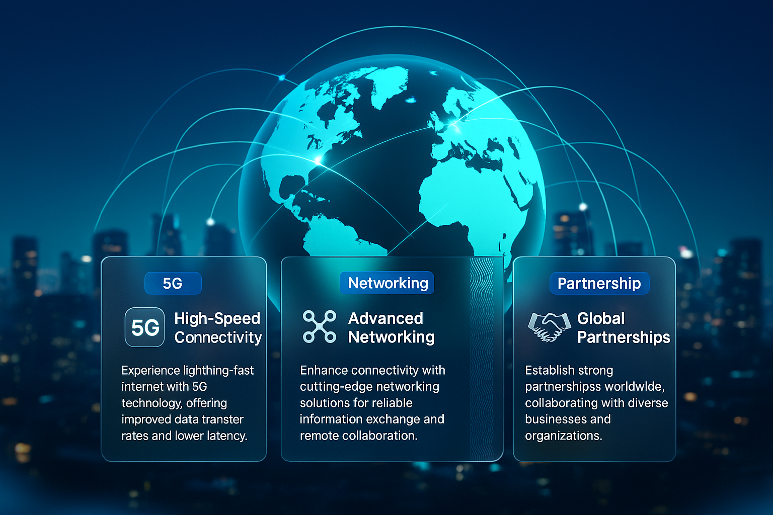 A digital depiction of a smart city at night, showcasing 5G connectivity and networking. The globe symbolizes global communication, with city lights in the background.
